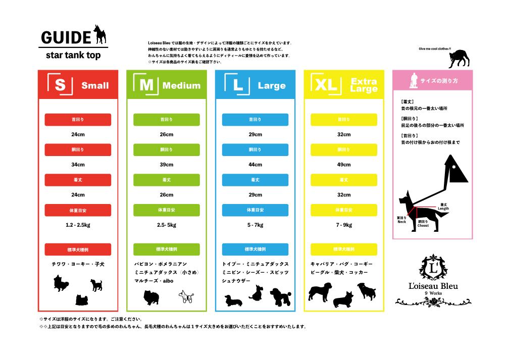【S】首回り/ 24cm 胴回り/ 34cm 着丈/ 24cm 体重目安/ 1.2kg - 2.5kg